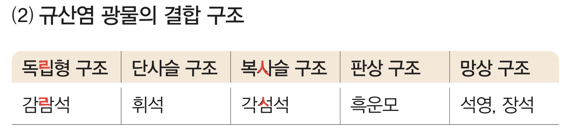 규산염 광물의 각 결합 구조에 해당하는 광물의 예시가 나와 있는데 <독립형 구조 : 감람석, 복사슬 구조 : 각섬석>입니다. 딱 봐도 헷갈릴 수 밖에 없게 생겼죠. 어떤 원리가 존재하는 것도 아니고 말이죠.(실제로 시험 전 날까지 헷갈려하는 학생도 꽤 있습니다) 그래서 위의 그림처럼 독립형 구조에는 두번째 글자에 'ㄹ'이 있으니 감람석, 복사슬 구조에는 두번째 글자에 'ㅅ'이 있으니 각섬석. 이런식으로 외울 수도 있습니다.